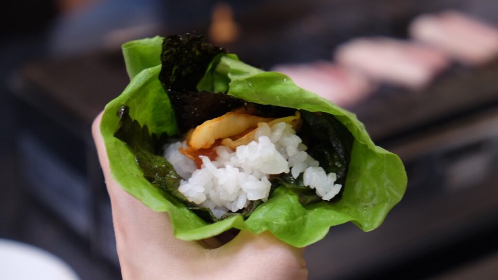 キムチ納豆と荏胡麻漬けが味噌だれの香ばしさとマッチして食べる手が止まらない。