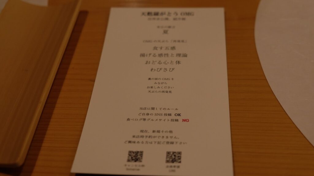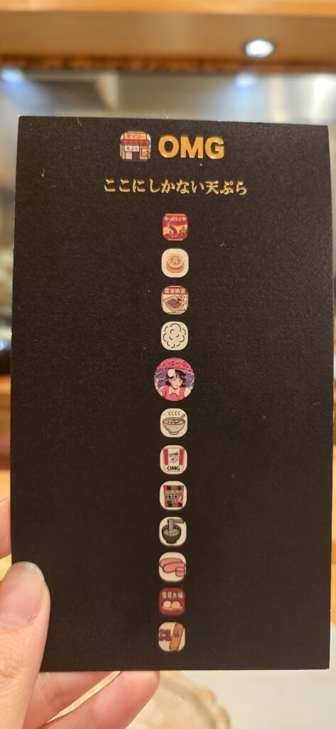メニューの絵のテーマは「大人のコンビニ」だそう。コンビニにあるものを天ぷらで再現するという試み。季節ごとに内容が変わるという。