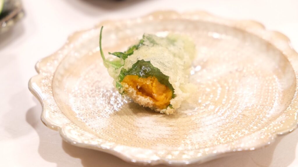 見た目は一般的なシソ天だが、塩水うにを塩抜きしてから自家製塩液に漬けて旨味を凝縮させている。