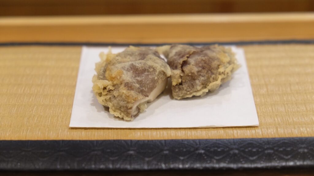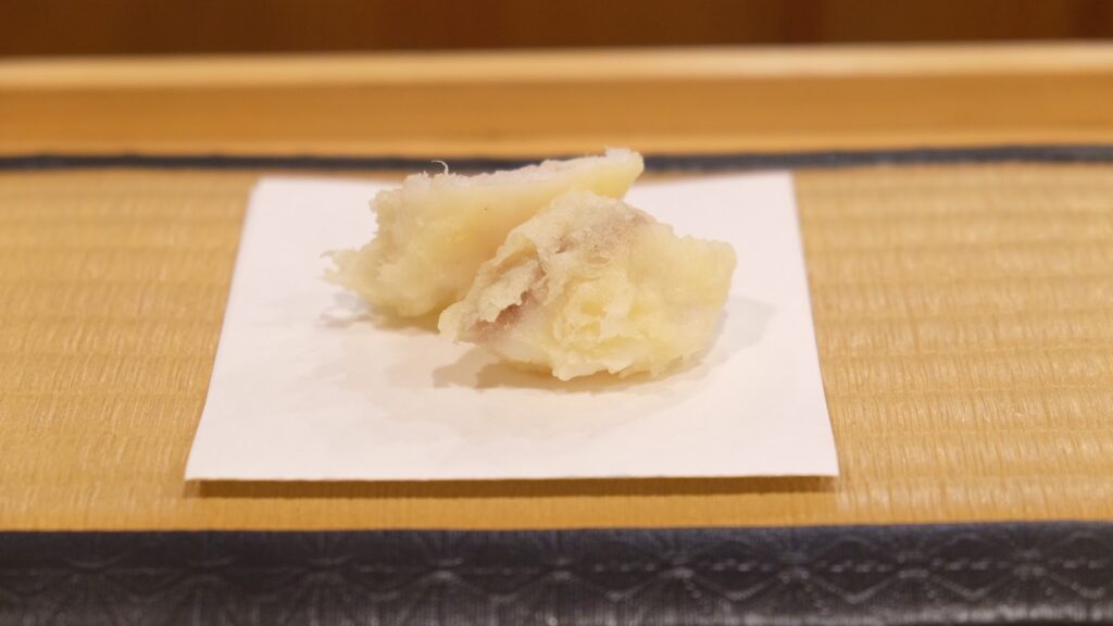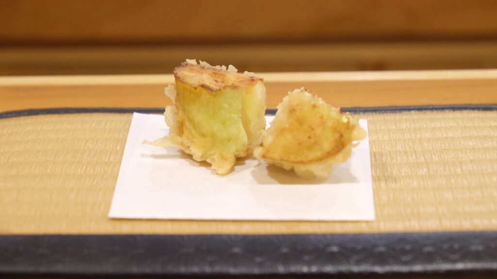 「水分を逃がさないため皮が厚くなる。その真ん中を使っている」とのこと。2度、3度と揚げてこのとろとろ感を出す。桜井シェフの技が光る。