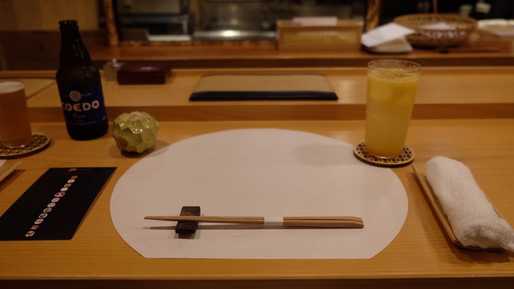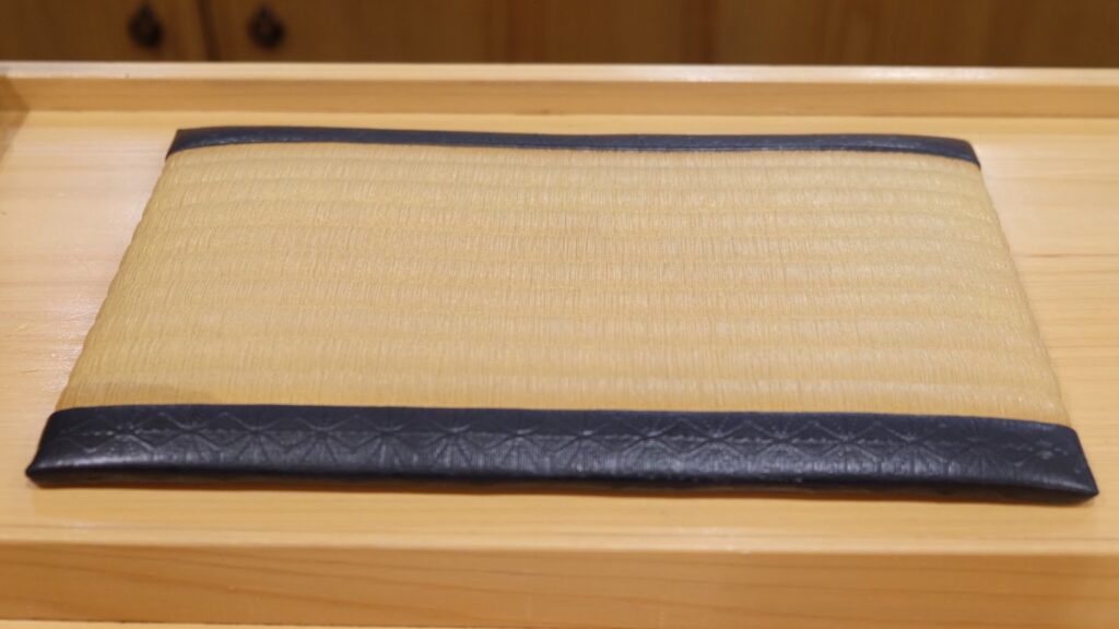 カウンターには小振りな畳が鎮座しており、こちらが天ぷら皿の特注品。陶器でできているとは思えず、触ると意外な質感に驚く。
