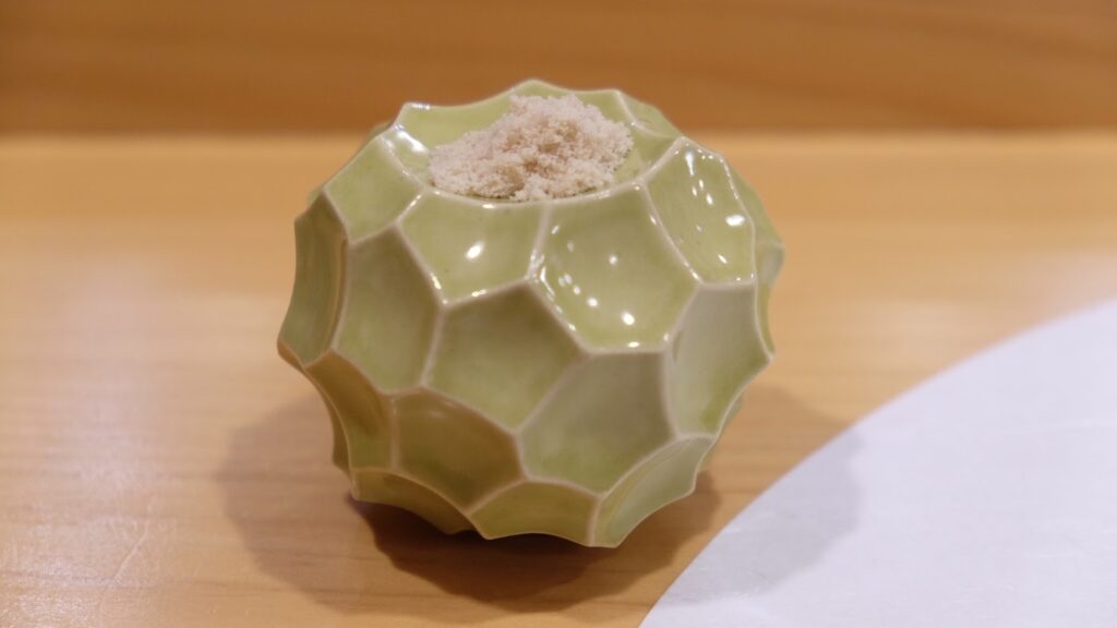 一口目は何もつけずに。二口目はわさびを添えて。やさしい甘さと胡麻の香りが広がる。